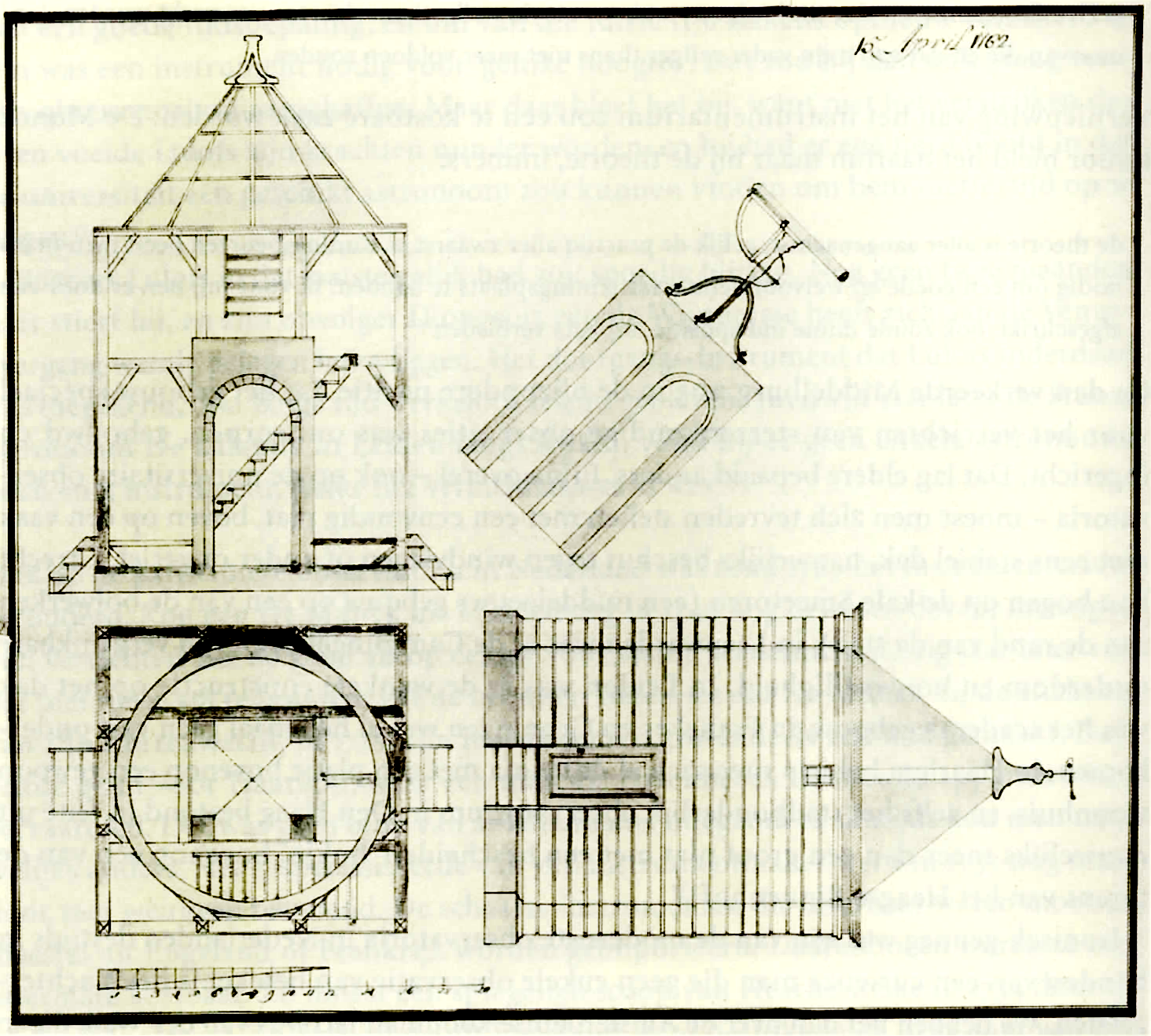A more practical reason was perhaps that Van de Wall only had a suitable observatory from 1758. This observatory, which was specially designed for the large telescope, was located in the garden of Van de Wall's country estate De Kievit, just outside the Amsterdam city limits. Van de Wall bought this country estate in 1766, after renting it from 1758. Ferrner is reported to be the first visitor to this building in 1759: 'four pillars of brick, driven deep into the ground, carried the floor on which the telescope stood. These four pillars were surrounded by a square plank house, and the whole roof consisted of a copper dome, which could be turned in the same manner as the roof of a windmill. From the peak of the dome to the bottom there was a slit, as wide as the diameter of the telescope, which could be opened and closed with pulleys and cranks. Thus, by rotating the roof and the telescope on its pedestal, one could observe the sky wherever one wanted.