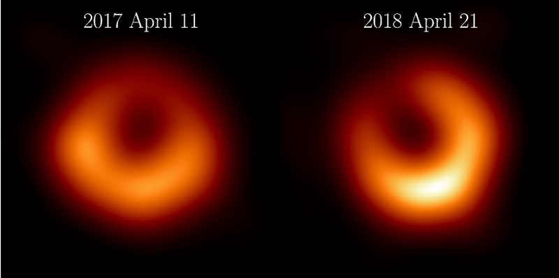 - A recent paper titled The persistent shadow of the supermassive black hole of M87 in the journal Astronomy & Astrophysics presents new images from the 2018 data that reveal a familiar ring the same size as the one observed in 2017. This bright ring surrounds a deep central depression, 'the shadow of the black hole', as predicted by general relativity. Excitingly, the brightness peak of the ring has shifted by about 30º compared to the images from 2017, which is consistent with our theoretical understanding of variability from turbulent material around black holes.