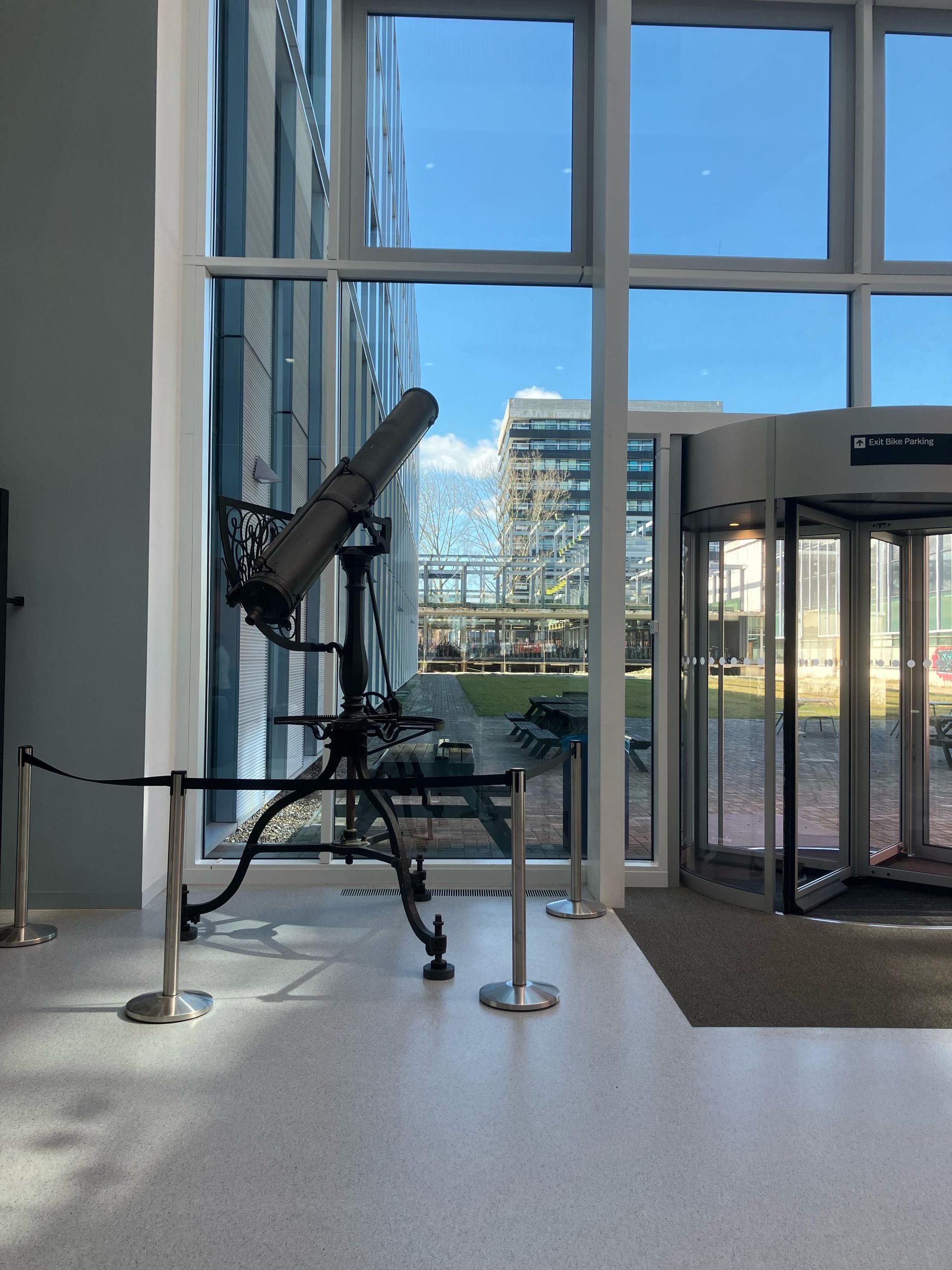 - The old telescope used to stand in the Huygens building, which housed the Leiden Observatory until last year’s move to the new Gorlaeus Building. Now, the telescope—resembling a cannon on a tripod—has found a beautiful and prominent new spot: right next to the grand staircase in the atrium.