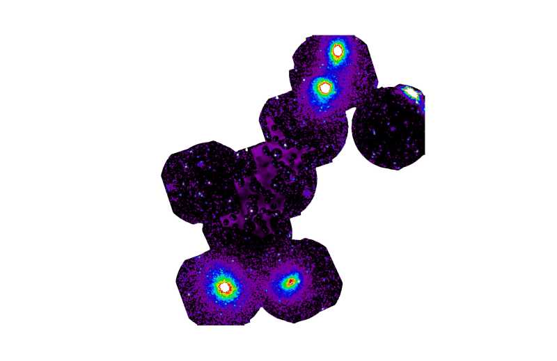 IMAGE: Warm hot intergalactic medium in the middle between the bright dots. Composite image based on X-ray data from the space telescopes JAXA Suzaku and ESA XMM-Newton. (c) Migkas et al.