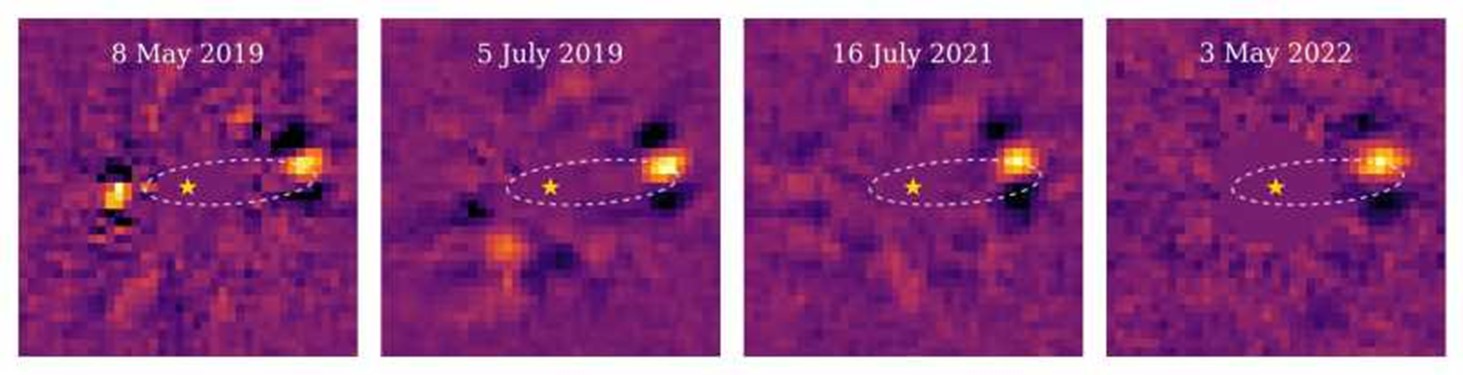 IMAGE: The newly discovered exoplanet HD 135344 Ab can be seen as a yellow dot on the right side of the image. It was measured in 2019 (2x), 2021, and 2022. The empty purple circle with the star in the middle indicates the location of the corresponding star. This star was filtered out, first by a coronograph and further by digital post-processing. (c) Stolker et al.